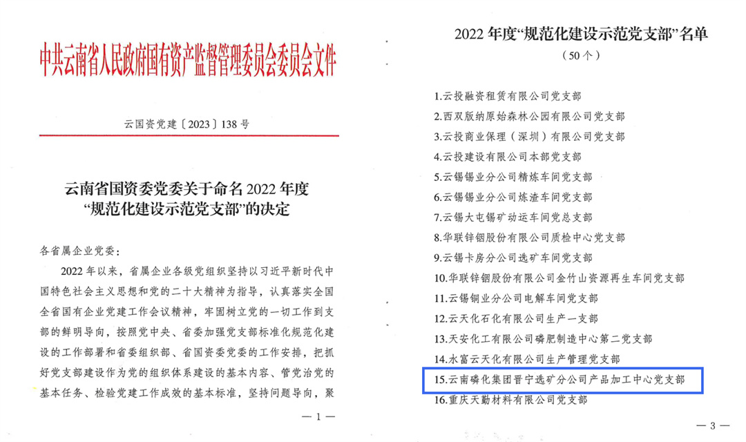 2023年以來,公司黨委按照云天化集團黨委《基層黨組織建設“三抓三促”工作方案》要求,對照國有企業黨支部規范化建設標準,扎實開展達標創建工作。過程中,公司晉寧選礦產品加工中心黨支部深入貫徹落實云天化打造“高質量黨建引領高質量發展新典范”的工作要求,緊扣公司“建設國際一流磷礦采選企業、國內綠色飼料添加劑領軍者、云南省固廢資源化利用先行者”戰略定位,以“守兩本、恒精益、筑磷基、致一流”為目標,從基層黨支部班子建設、黨員先鋒模范作用發揮、工作機制健全完善、服務生產經營中心成效等方面著手,進一步推動黨建工作創新發展,全方位推進黨支部黨建工作提質,營造“強規范、爭示范、趕先進、創佳績”的創建工作氛圍,示范黨支部創建工作成效顯著。通過逐級推薦、擇優遴選、征求意見、實地復核、集中公示等環節,最終被云南省國資委黨委命名為2022年度“規范化建設示范黨支部”。
