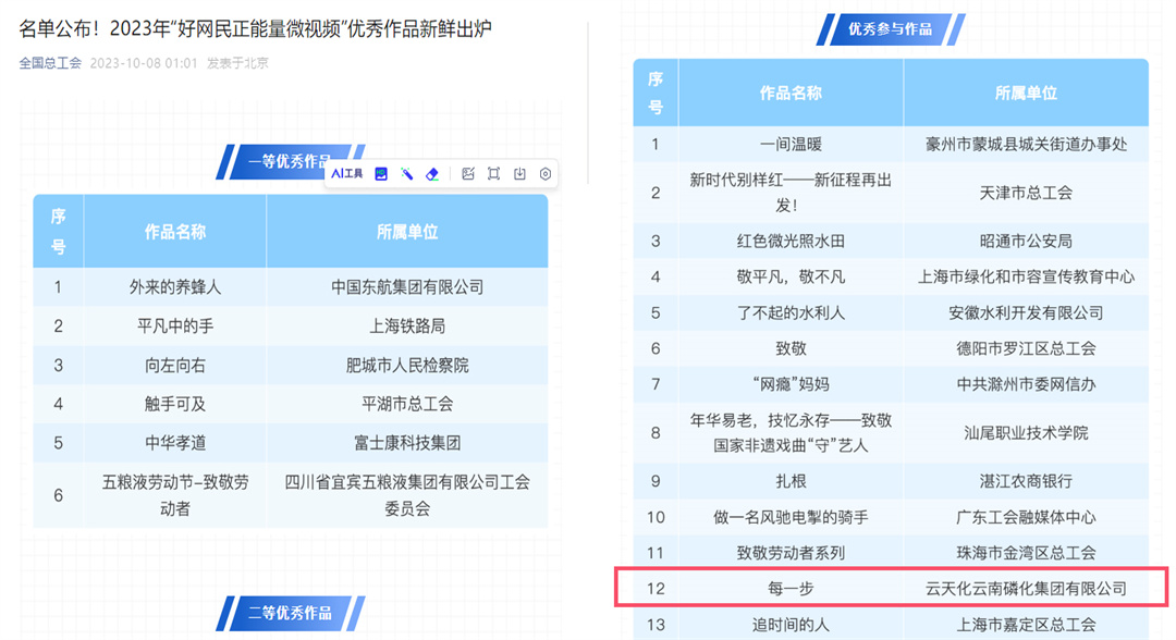 10月8日,由中華全國總工會和中央網信辦聯合主辦的2023年“網聚職工正能量 爭做中國好網民”主題微視頻評比活動揭曉結果,公司選送的微視頻作品《每一步》獲評中華全國總工會2023年“好網民正能量微視頻”優秀獎,這是公司近年來在同類型活動評選中獲得的第一個國家級榮譽。