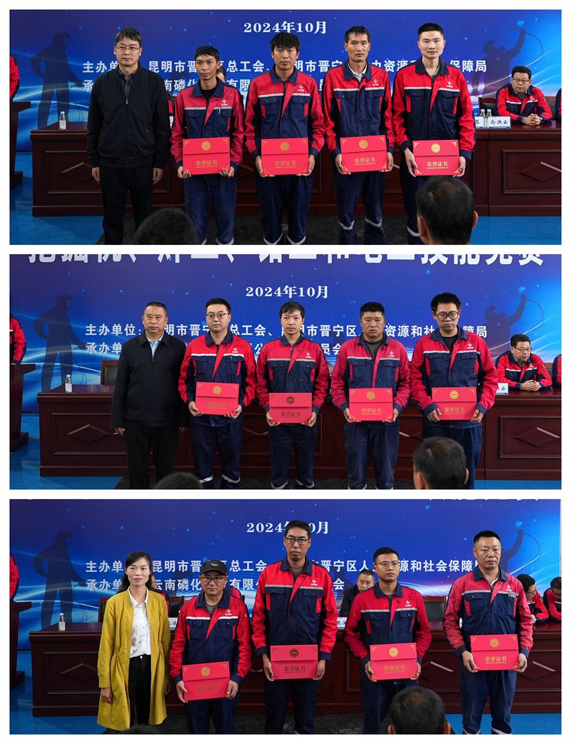 經過一天的激烈比拼,公司昆陽磷礦職工郭林慶、檢維修中心職工沈君縣和楊強、尖山磷礦職工王正山以優異的實操成績分別奪得挖掘機、焊工、電工、鉗工技能競賽冠軍,并被授予2024年晉寧區挖掘機、焊工、電工、鉗工技能競賽“技術狀元”榮譽稱號。